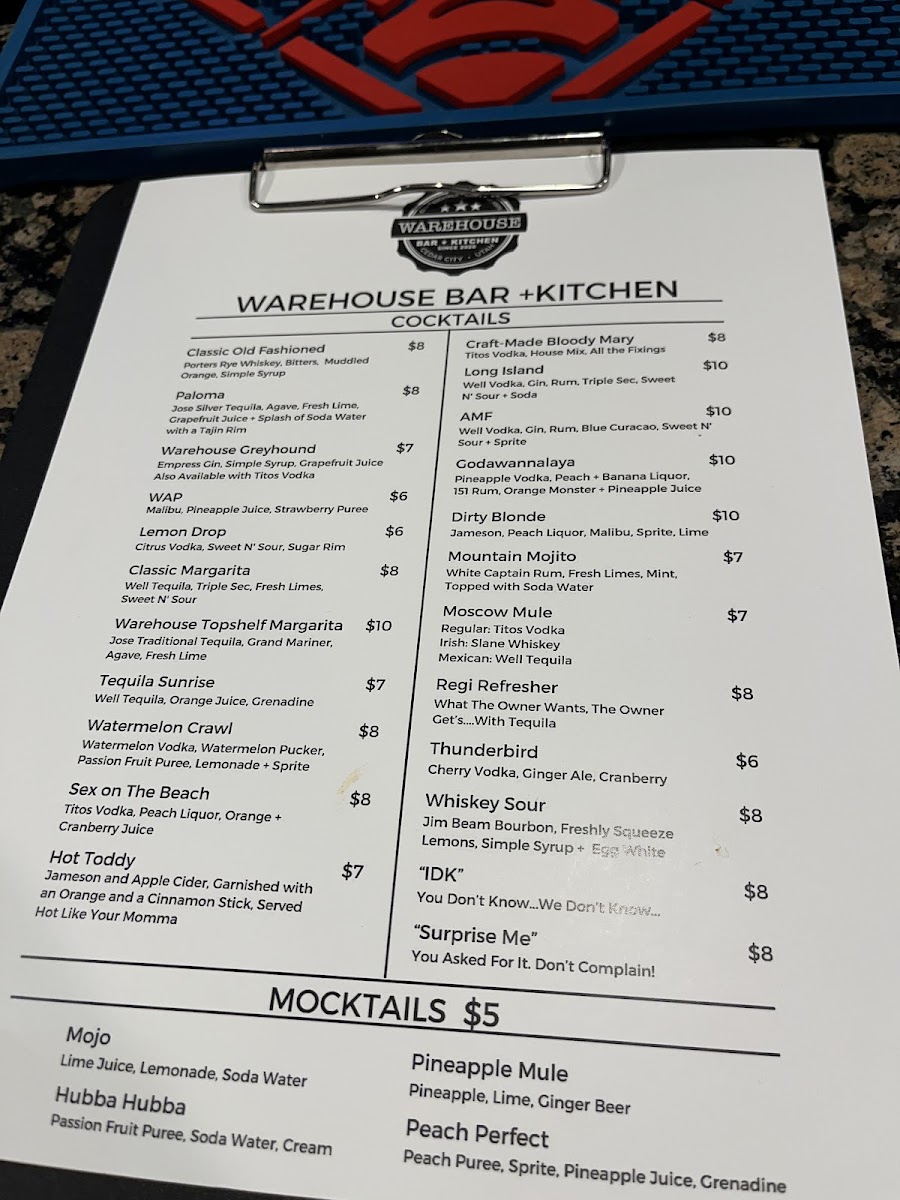 Welcome to Warehouse Bar Kitchen, a hidden gem located in Cedar City, UT, where casual dining meets culinary delight. This vibrant spot boasts an enticing menu that redefines classic bar fare. Start with the Zucchini Fries, perfectly battered and served with a zesty chipotle ranch for dipping. For the main event, the chicken wings are a must-try—crispy, well-seasoned, and just the right level of heat. If you're in the mood for seafood, the Fish and Chips promise a delightful contrast of a crispy exterior and tender fish. Additionally, the famous funeral potatoes have garnered rave reviews for their rich flavor. Wash it all down with expertly crafted cocktails like the Espresso Martini or the refreshing Watermelon Crawl. With a lively atmosphere and attentive service, Warehouse Bar Kitchen is the perfect spot for both locals and visitors to unwind and savor great food and drinks.